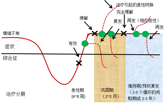 由于雙相障礙幾乎終生以循環(huán)方式反復發(fā)作,其治療目標除緩解急性期癥狀外,還應堅持全病程治療原則以阻斷反復發(fā)作。醫(yī)生應在治療開始前告知患者和家屬全病程治療的重要性及實施辦法,爭取良好的依從性。全病程治療可分為3個治療期: